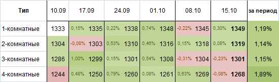 Динамика изменения стоимости квартир за неделю претерпела некоторые изменения по сравнению с предыдущей и выглядит так: