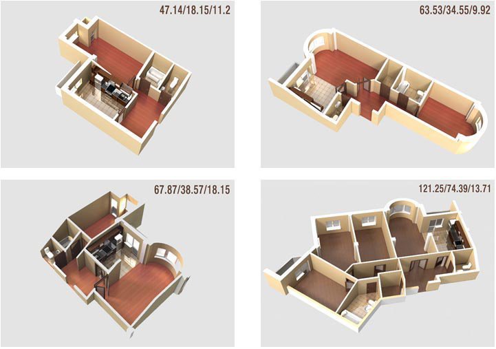Мы рады предложить Вам 1-комнатные (47 м2), 2-комнатные (63 м2, 68 м2) и 4-комнатные квартиры (121 м2) на 5−10 этажах.