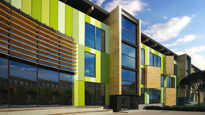В оформлении школы авторы предусмотрели экологичные и современные материалы: деревянные фасады, в здании также много остекления для естественного освещения. Цвета выбраны в желто-зеленых тонах, которые смотрятся очень свежо и выигрышно и зимой и летом.