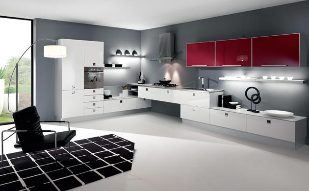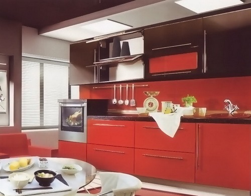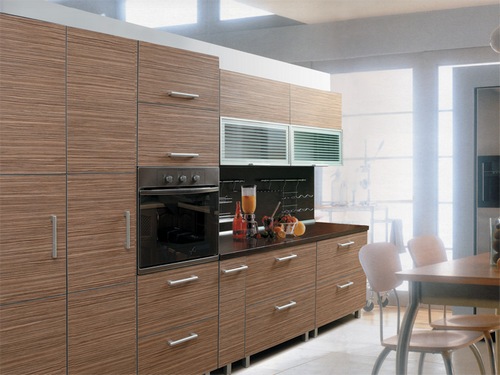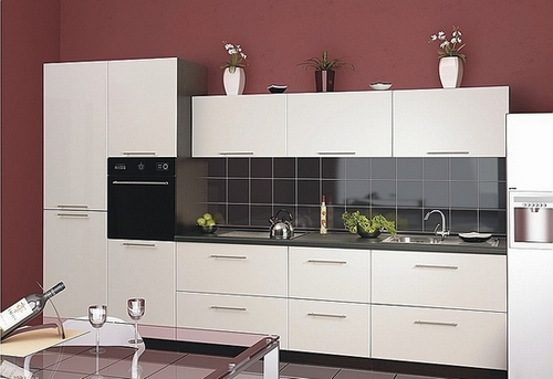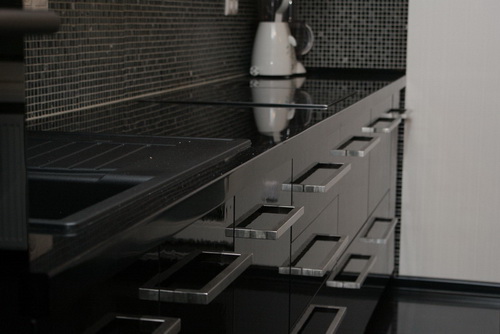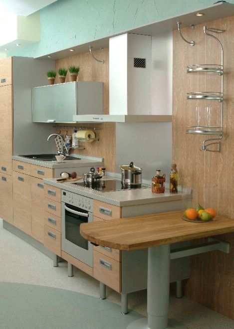 · ЛДСП (ламинированная древесностружечная плита) — самый бюджетный вариант, но при этом очень презентабельный внешне. А если сочетать его с качественной и стильной фурнитурой, «разбавлять» алюминиевыми фасадами, то бюджетность вашей кухни сможет подозревать только профессионал. Однако без дегтя не обошлось: ЛДСП не любит высокой влажности и не может быть радиусной, то есть вогнутой, выпуклой — в общем, форменной.