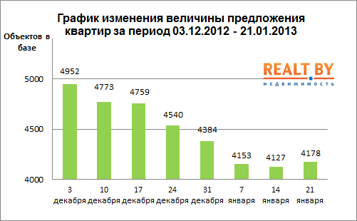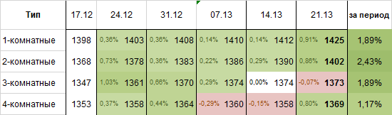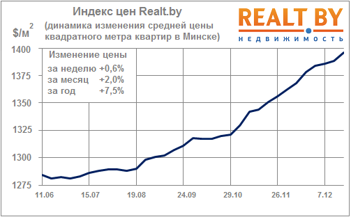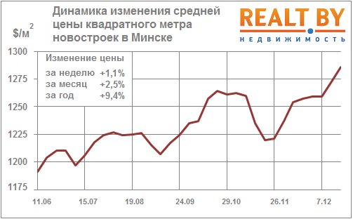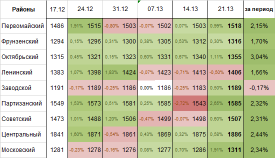 В отличие от предшествующей недели, когда средние цены упали у половины районов, минувшая неделя прошла под знаком тотального роста. Все районы, за исключением Ленинского показали положительную динамику. У Фрунзенского, Заводского, Центрального и Советского районов рост был в интервале 0,3% - 0,6%. Остальные районы приросли на 1,0% и выше. Отдельно следует выделить ситуацию в Московском районе. Здесь очень долгое время цена колебалась в минимальном диапазоне 1275−1285 $/м2 и лишь на минувшей неделе резко выстрелила на 1,9%. Ситуация с месячной динамикой в целом ровная. Лучший показатель здесь у Октябрьского района (+3,04%), единственное падение цен за месяц отмечено у самого дешевого Заводского района (-0,17%).