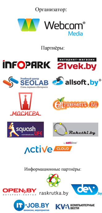 Но не думайте, что единственной наградой участникам станут приятные впечатления — организаторы и партнёры турнира подготовили целый ряд подарков для лучших игроков: электронные книги Wexler.Book и бонусные банковские карты с 100 000 рублей на счету от интернет-магазина 21vek.by и МТБанка; платиновые сертификаты на обучение по одной из программ на выбор от Учебного центра SEOLAB; увлекательная игра «Опята» от интернет-магазина настольных игр для детей и взрослых «Мосигра»; сюрприз от магазина эмоциональных подарков Elpresent.by; подарки от спортивного интернет-магазина Raketki.by; сертификаты на игру в сквош в клубе SQUASH-LIFЕ; антивирус Kaspersky Internet Security 2013 с возможностью установки на 2-х персональных компьютерах сроком на 1 год от магазина лицензионного софта Allsoft.by, сертификаты на хостинг по тарифному плану «Эксперт» (для победителя) и на регистрацию домена в зоне .by со скидкой 99% от Active.by.