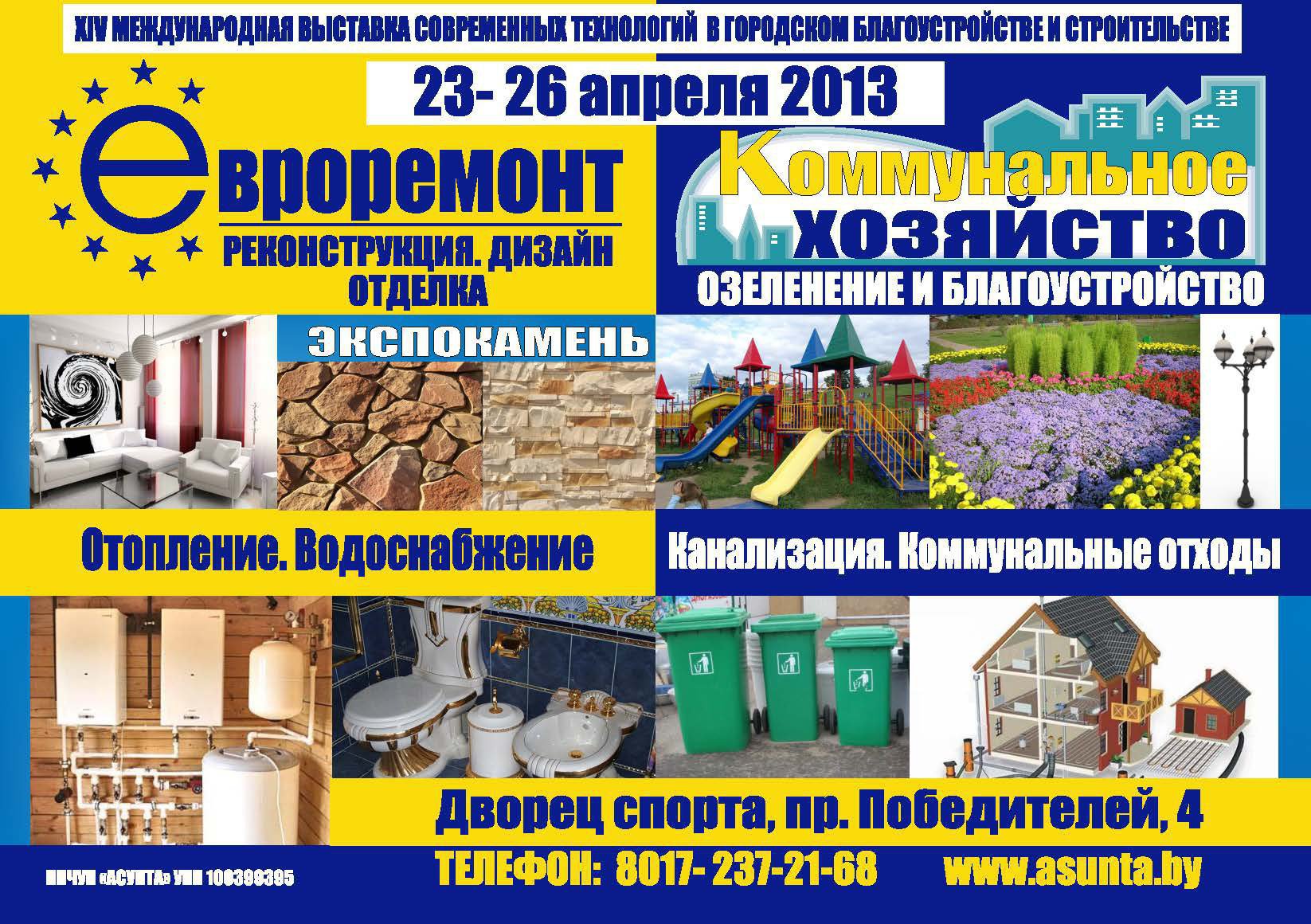 С 23 по 26 апреля во Дворце Спорта, пр. Победителей, 4 состоится 14-ая международная выставка современных технологий, оборудования и услуг в коммунальном хозяйстве, городском строительстве и благоустройстве «Коммунальное хозяйство. Евроремонт «. В рамках форума проводятся специализированные выставки и салоны разной тематики: «Отопление. Водоснабжение. Сантехника. Вентиляция», «Экспокамень», «Бетонэкспо», «Канализация. Коммунальные отходы», «Озеленение и благоустройство», «Евроремонт. Квартира. Коттедж-2013»
