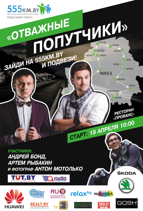 Остались считанные дни до старта самого масштабного и беспрецедентного национального проекта, который объединит сотни тысяч водителей и попутчиков по всей стране, онлайн и оффлайн. 19 апреля двое смелых парней в лице Андрея Бонда и Артема Рыбакина сделают вызов всем пользователям Байнета. Им предстоит проехать всю Беларусь за сутки, находя предложения подвезти (попутный транспорт) исключительно в Интернете.
