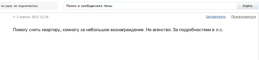 Помимо обращений в агентства, я разместил объявления на различных тематических сайтах и форумах. Однако это ничего не дало — спрос, увы, превышает предложение. Поэтому почти круглосуточно приходилось активно «шерстить» те же самые сайты, чтобы в числе первых позвонить владельцу жилья. Кроме того, я распечатал объявления и поручил расклеить их в частном секторе. Конечно, не обошлось и без активного использования социальных сетей.