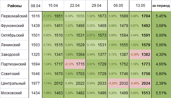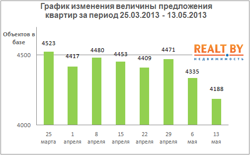 За две майские недели объем выставленных на продажу квартир резко сократился. Так, за минувшую неделю совокупное предложение снизилось на 3,51%. Больше всего из базы ушло 1- и 2-комнатных квартир (-6,0% и -3,4% соответственно). Число 3-комнатных квартир уменьшилось на 2,5%. Количество 4-комнатных квартир осталось практически неизменным.