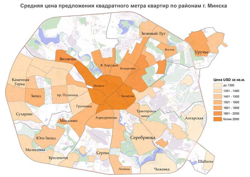 На квартальной карте города Минска установилась следующая ценовая ситуация: