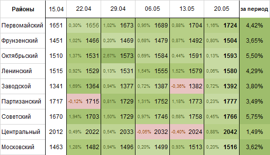 Динамика изменения цен предложения квартир в районах Минска на 20 мая выглядит следующим образом: