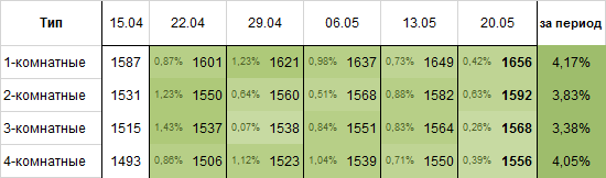 Динамика изменения стоимости квартир за неделю претерпела следующие изменения по сравнению с предыдущей и выглядит так: