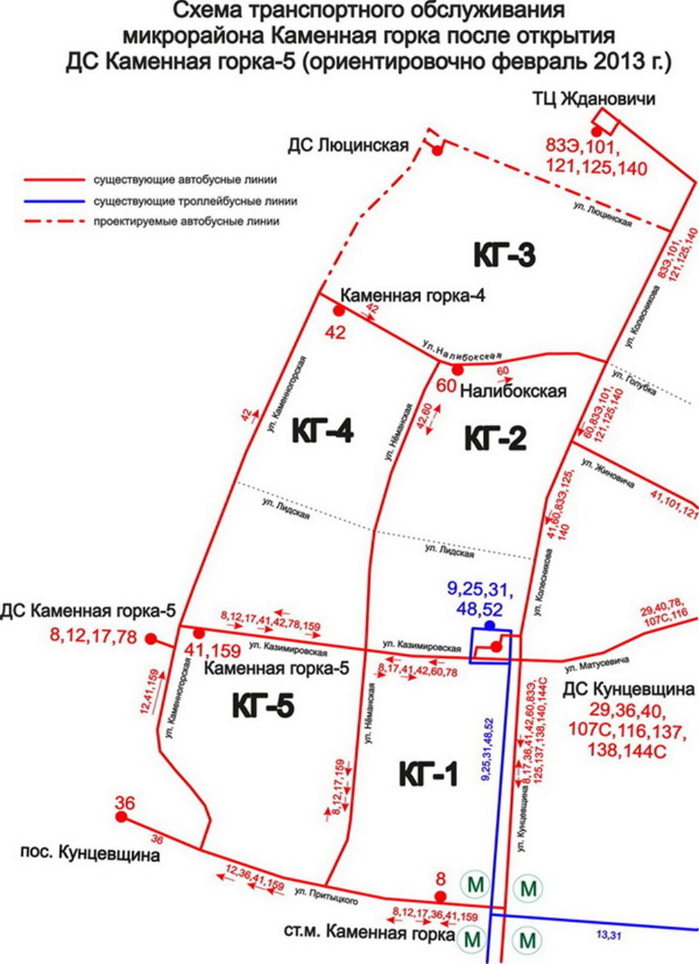 Если въезжать в Минск по гродненской трассе, то возникает ощущение, что въезжаешь в футуристический средневековый город. Типовые дома по улице Каменногорской напоминают стены, над которыми возвышаются 22-этажные башни, расположенные по улице Притыцкого. Правда, организована Каменная горка не как средневековый город. Нет тут петляющих улочек, а сам микрорайон чётко разбит на квадраты. Параллельно «рву» МКАДа идёт улица Каменногорская. С востока Каменную Горку от Минска отделяют улицы Кунцевщина и Колесникова, а посередине микрорайона проходит улица Неманская. Эти улицы можно назвать линиями долготы микрорайона, а вот широты, которые делят микрорайон на кварталы, — это улицы Казимировская, Лидская, Налибокская и Люцинская. Собственно, Каменная Горка-1 и -5 — это то, что находится между Притыцкого и Казимировской, а -2 и -4 — между Лидской и Налибокской. А дальше на север — Каменная Горка-3, по краю которой и проходит Люцинская. С высоты птичьего полёта всё просто как в аптеке. Но мне много раз приходилось блуждать по микрорайону, пытаясь разобраться, в каком направлении я иду и где тут Налибокская, а где Казимировская.