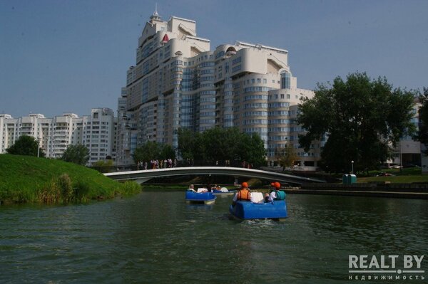 С воды инспекторы могли хорошо рассмотреть еще один проект из стекла и бетона — высотный административно-торговый центр Royal Plaza. Остекление высотки все еще продолжается. Это пока второй по высоте небоскреб Минска. И его лучше всего было оценить с воды. Большое хорошо видится только на расстоянии.