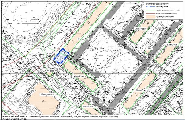 Разместить магазин планируется между стадионом и жилыми домами. Сегодня эта территория пустует. Площадь застраиваемого участка — 0,05 га. Общая площадь здания — 450 квадратных метров.