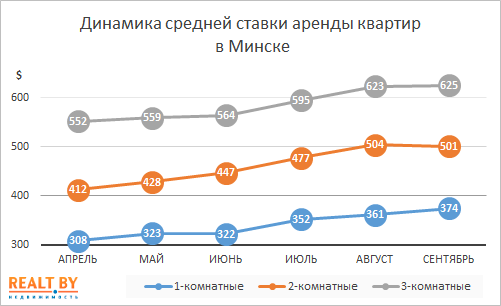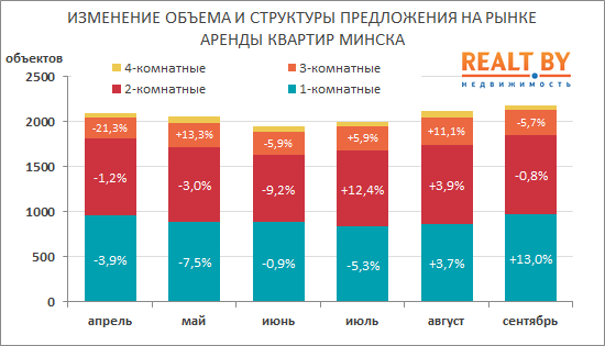 Третий месяц подряд растет предложение квартир в аренду. Общий рост в сентябре составил 2,6%. Впрочем, если в августе больше объявлений становилось по всем без исключения квартирам, то в сентябре общий рост предложения связан исключительно с 1-комнатными квартирами, число которых выросло на 13%. Что касается 2- и 3-комнатных квартир, то их количество несколько сократилось. Для того, чтобы окончательно «успокоиться», рынку нужно как минимум на четверть больше свободных квартир.