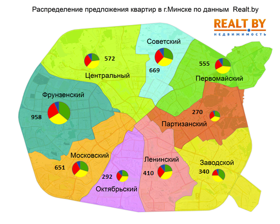 Распределение предложения квартир по районам Минска выглядит следующим образом: