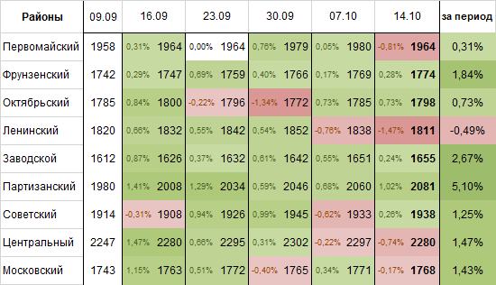 Динамика изменения цен предложения квартир в районах Минска на 14 октября выглядит следующим образом: