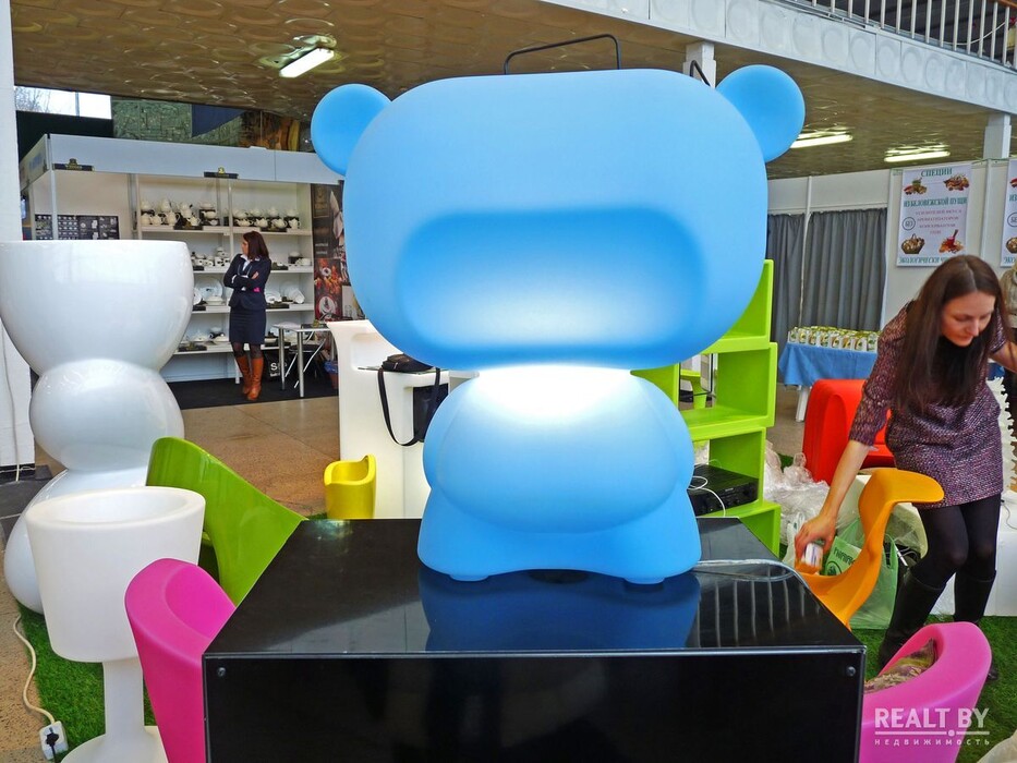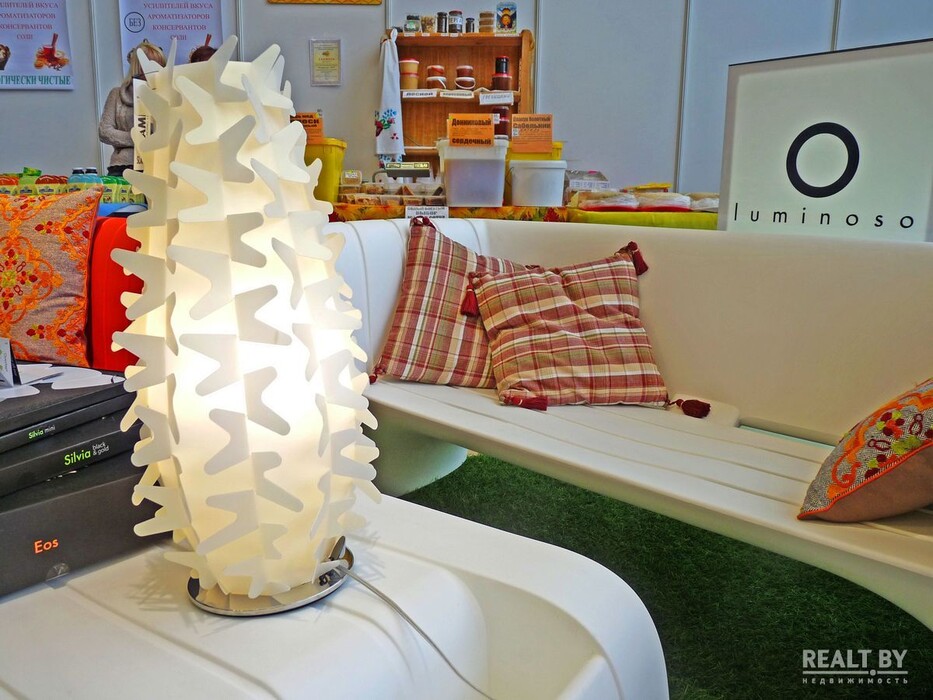 Площадка ООО «Ё-Лайт» привлекает разноцветьем и светящими объектами, в которых вблизи легко распознать мебель из пластика. Продукция производится в Италии, Дании, Финляндии и представлена брендами SLIDE, 21st, SLAMP, VITA. Нестандартные формы и исполнение светильников, диванов, кресел и столиков сразу напоминают продукцию IKEA. Только в данном случае на стоимости сэкономить не получится. Дешевыми предметы интерьера назвать нельзя, разве что относительно доступными. К примеру, светящийся изнутри розовый диван, точь-в-точь как в комнате у Барби, стоит 980 евро. Пластиковый стул салатового цвета — 280 евро. Небольшие светильники обойдутся от 40 до 100 евро, стоимость больших светильников из гусиного пера может достигать 400 евро — все делается вручную. Чем обоснованы такие цены? Во-первых, тем, что каждый предмет индивидуально продумывается известным дизайнером Каримом Рашидовым. Во-вторых, в производстве используются алюминиевые формы, с помощью которых специальная масса превращается в бесшовные фигуры. Как признались представители компании, белорусскому рынку такие товары интересны, пользуются спросом, как для коммерческих целей, так и для украшения интерьера частных домов.