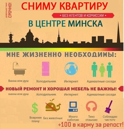 - «Аккуратный, работающий парень, не имеющий вредных привычек (это я), ищет комнату в Минске. Без особых требований, главное — приятные соседи и чистая квартира»