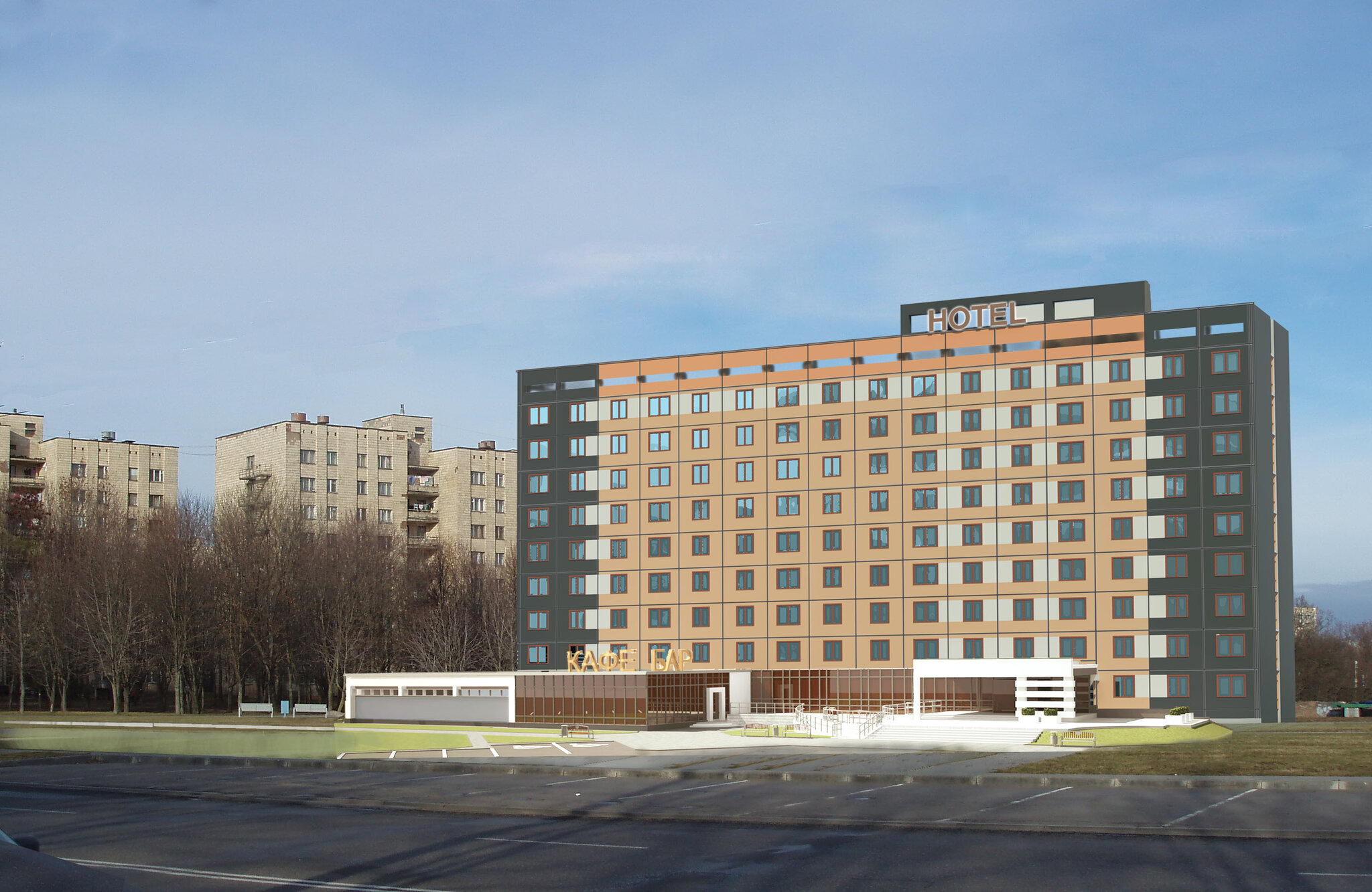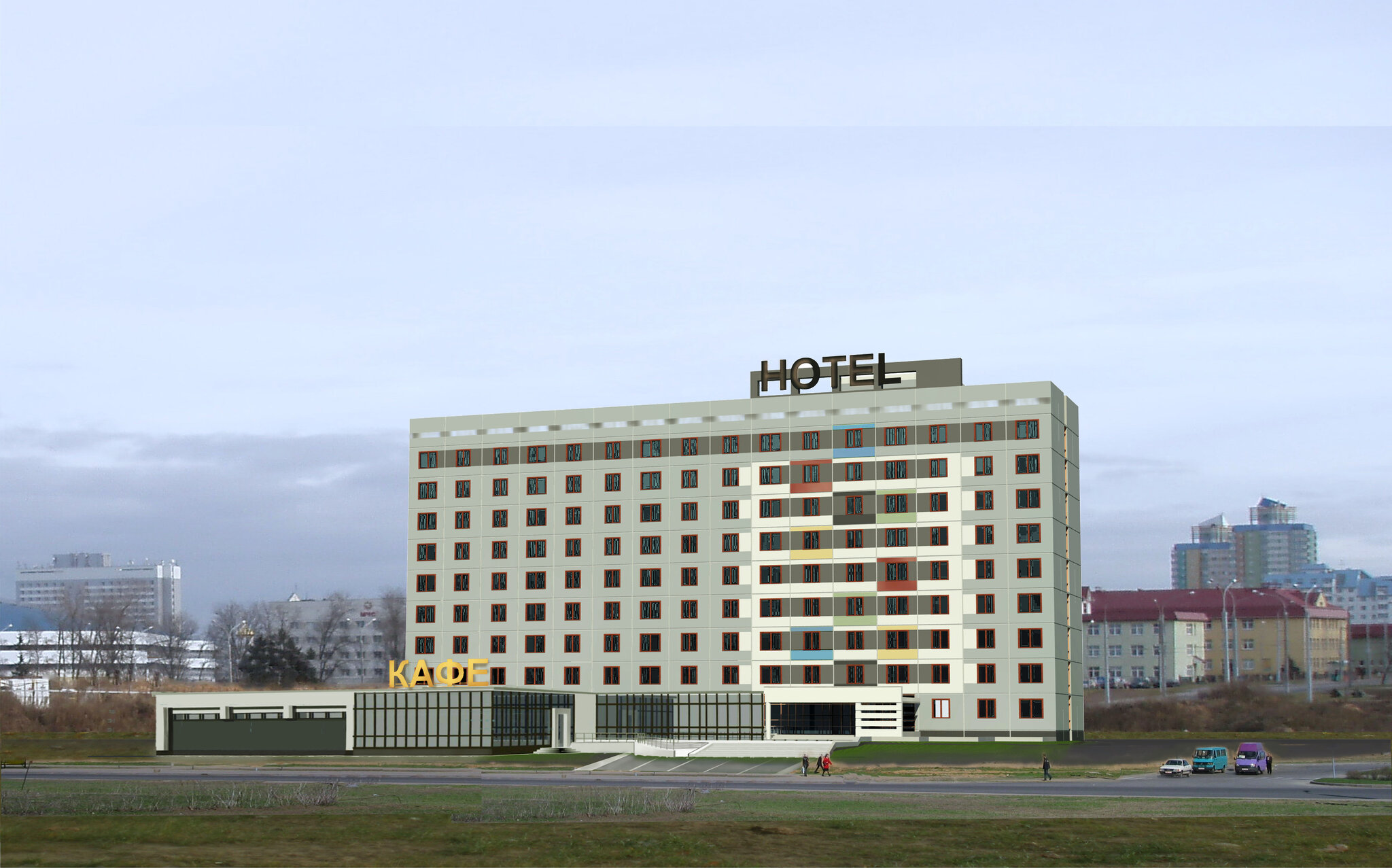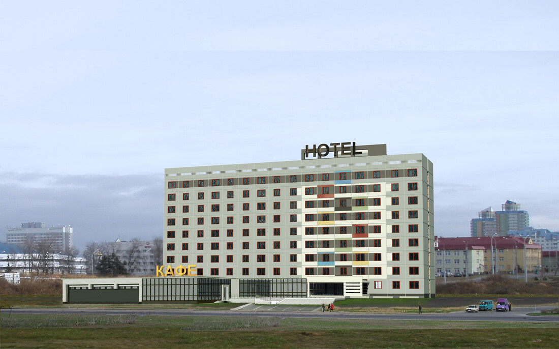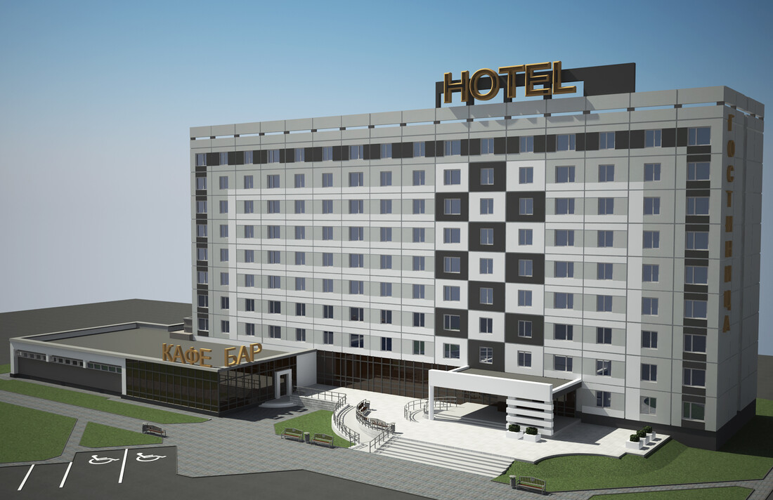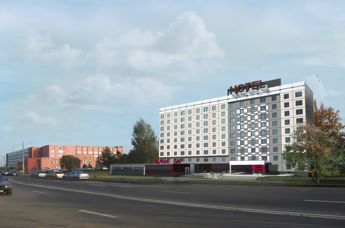 Сеть отелей эконом-класса — новинка для Беларуси. 9-этажные здания выполнены из железобетонных панелей. Внешне они идентичны, отличаются лишь расцветкой фасадов. К жилым корпусам пристроены одноэтажные кафе.