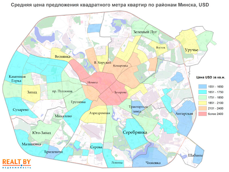 Распределение предложения квартир по районам Минска выглядит следующим образом: