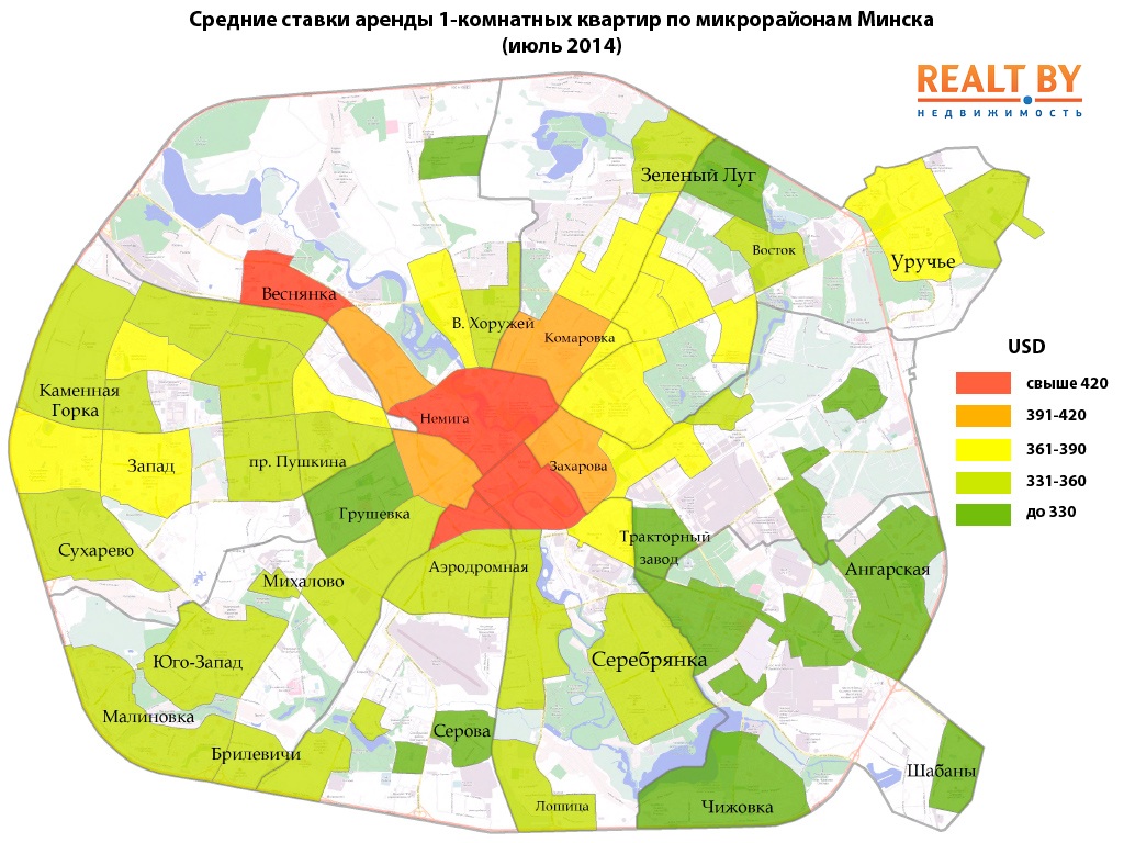 Предложение в спальных микрорайонах столицы постепенно сужается, однако это пока не отражается на средних арендных ставках. В 2014 году расслоение в ценах между центром и окраиной города куда более отчётливое, чем годом ранее. Тогда, на фоне ажиотажного спроса, средние ставки аренды в спальных микрорайонах были лишь незначительно ниже, чем в центре.