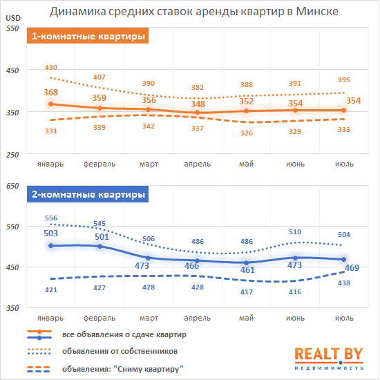 В то же время результаты июля показали, что арендаторы готовы платить за съемное жилье больше, чем месяцем ранее. Особенно значительный рост предполагаемой арендной ставки (более чем на $ 20) наблюдался по запросам «сниму 2-комнатную квартиру».