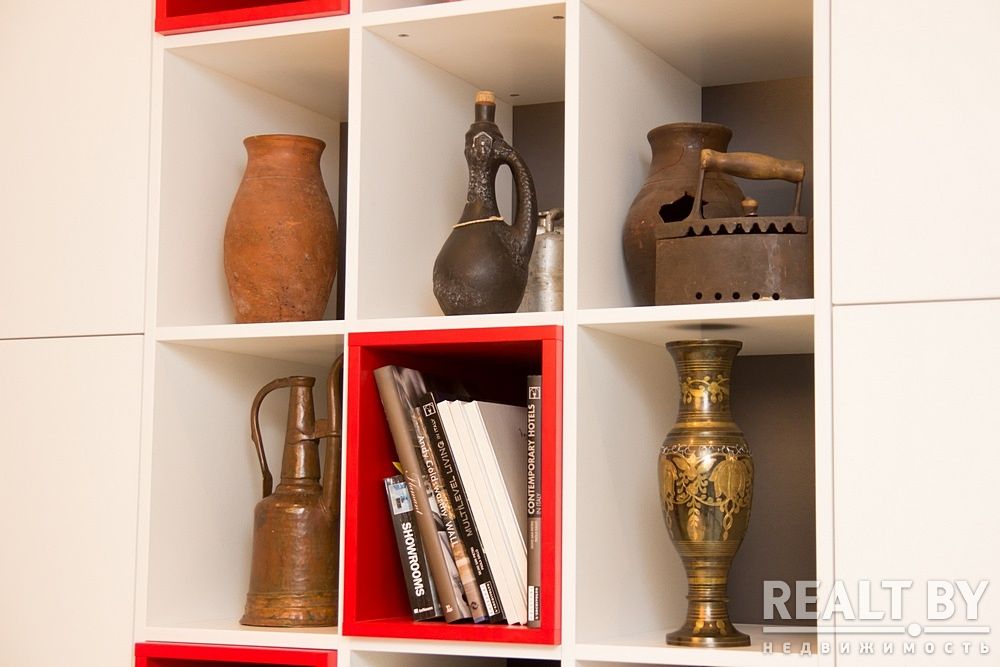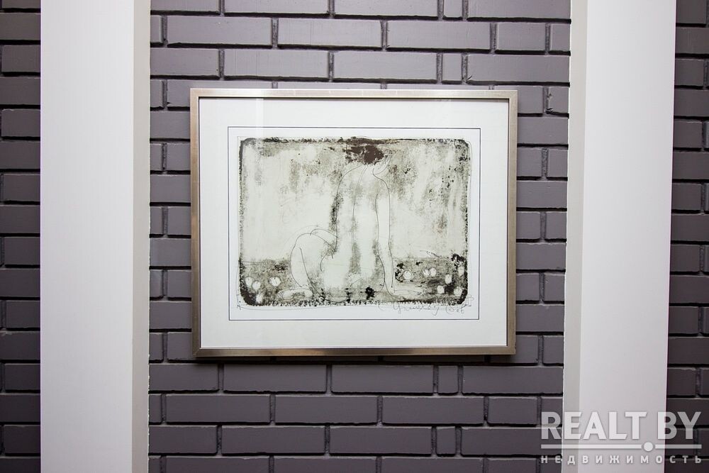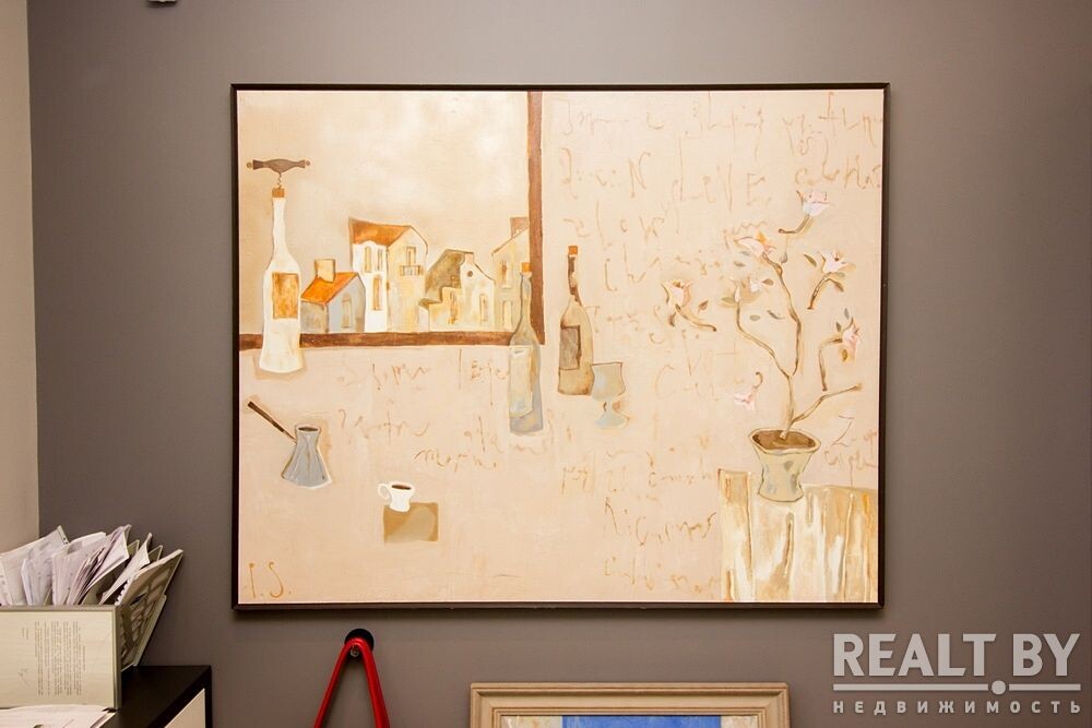 В библиотеке много профессиональной литературы, привезенной с выставок, международных дизайн-конференций, а также стеллаж для подарков от заказчиков из разных стран. Внимание привлекает работа художника Антона Шапо «Девушка главного героя».