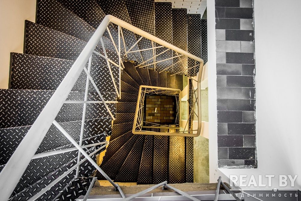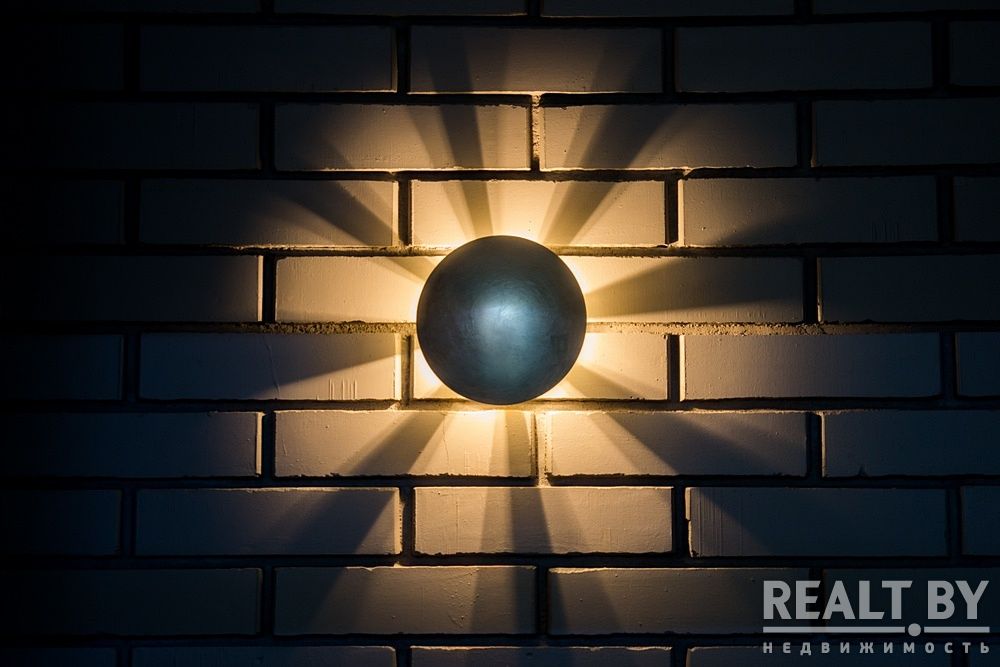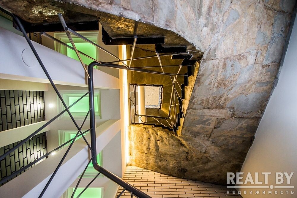 Спускаемся на цокольный этаж по лестнице. Она сделана в брутальном стиле: необработанный бетон только сверху оформлен в грубый металл. На стене есть, казалось бы, тень от перил лестницы, но на самом деле это роспись.