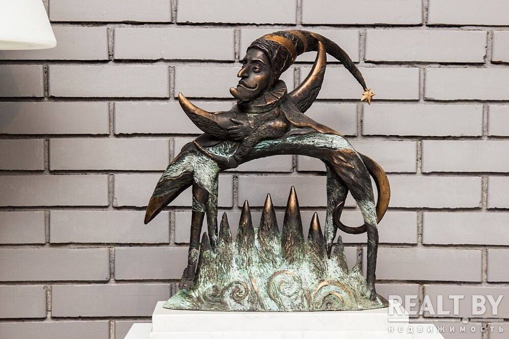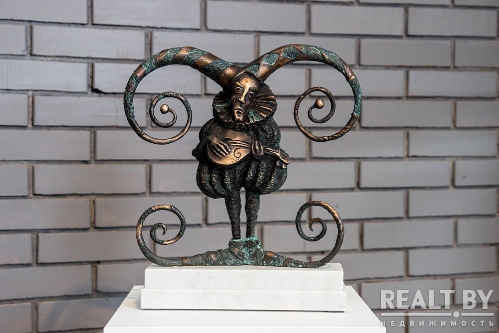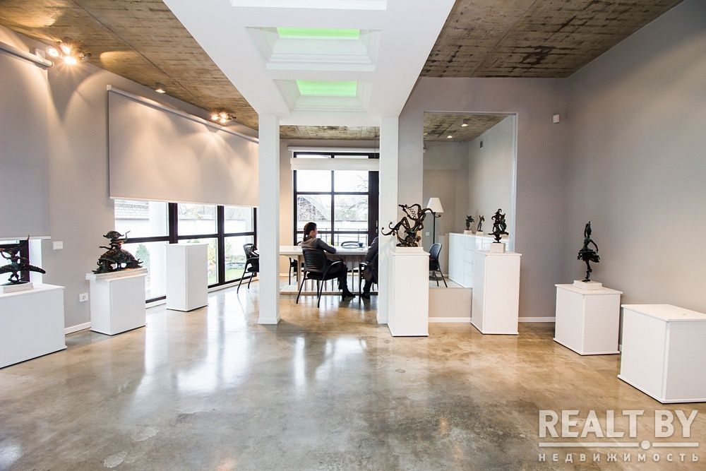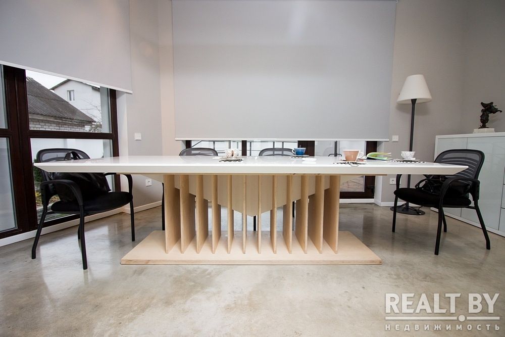 В шоуруме стоит большой белый стол — авторская работа Студии. Здесь с помощью проектора проводят презентации архитектурных проектов. Кроме того, в шоуруме можно посмотреть работы белорусских художников и скульпторов.