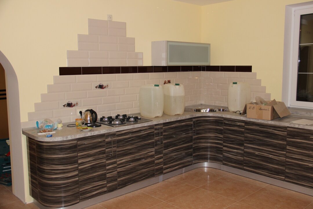 На фото — новенький коттедж, необеспеченный водой. Сейчас в нем живет семья из четырех человек: родители и двое детей. Вместо смесителя на кухне — канистры с водой, в туалете — ведро для слива. Ремонт уже давно закончен, установлена мебель и техника, и все было бы готово для проживания, если бы не пустые слова чиновников, которые вот уже год клятвенно обещают провести в поселок воду. Не дожидаясь милости госаппарата, летом семья заселилась в новый коттедж и понемногу приспособилась к новым, ухудшенным жилищным условиям.