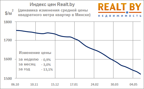 После четырех относительно спокойных недель снижение цен на квартиры в Минске вновь ускорилось, а его темпы вплотную приблизились к максимальным в 2015 году показателям. Общее снижение городского индекса составило 0,9%, в результате чего средняя цена предложения квартир в Минске достигла отметки в 1521 $/м2.