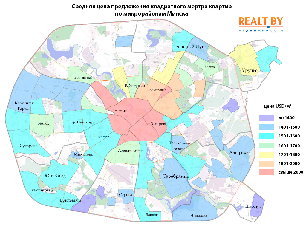 В Центральном и Заводском районах города снижение цен превысило 1,0%. Примечательно, что в Заводском районе средняя цена предложения квартир опустилась ниже отметки в 1400 $/м2. Среди остальных районов Минска снижение цен колебалось от 0,5% до 1,0%. В Партизанском районе в очередной раз за последние месяцы отмечена положительная ценовая динамика.