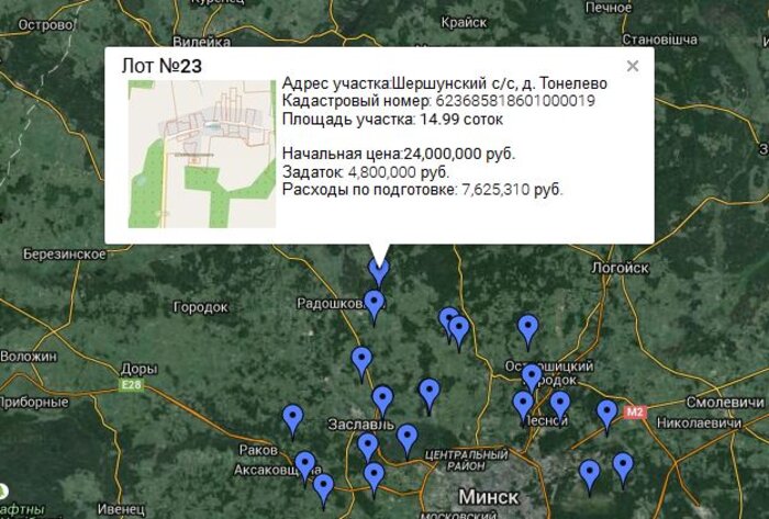 Участок, выставленный на аукцион в деревне Бахметовка, также удобный для строительства. Он располагается на окраине села прямо возле леса, рядом с жилыми домами. Площадка участка ровная и добротная. От Минска к деревне ведет асфальтированная трасса, подъезд сносный — неплохая накатанная дорога. Вдоль участка проходит линия электропередач.