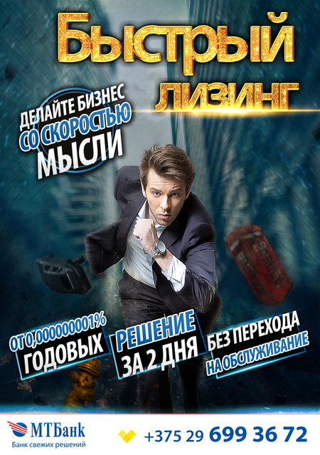 Не важно, что Вам нужно — подержанный или новый автомобиль — МТБанк готов предоставить всю необходимую сумму финансирования, а если Ваши аппетиты не так огромны и Вам нужно не более 48 000 USD, то Вы даже сможете обойтись без поручителей. Пришло время объявить ставку для тех, кто хочет делать бизнес со скоростью мысли — от 0, 1% годовых, но и это еще не все преимущества нового блокбастера.