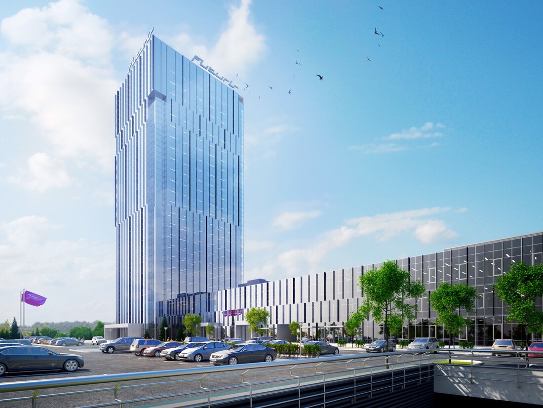 К 26-этажной башне бизнес-центра «Футурис» примыкает 3-этажное современное здание, где разместится крупный торгово-развлекательный центр и офисы VIP-класса: