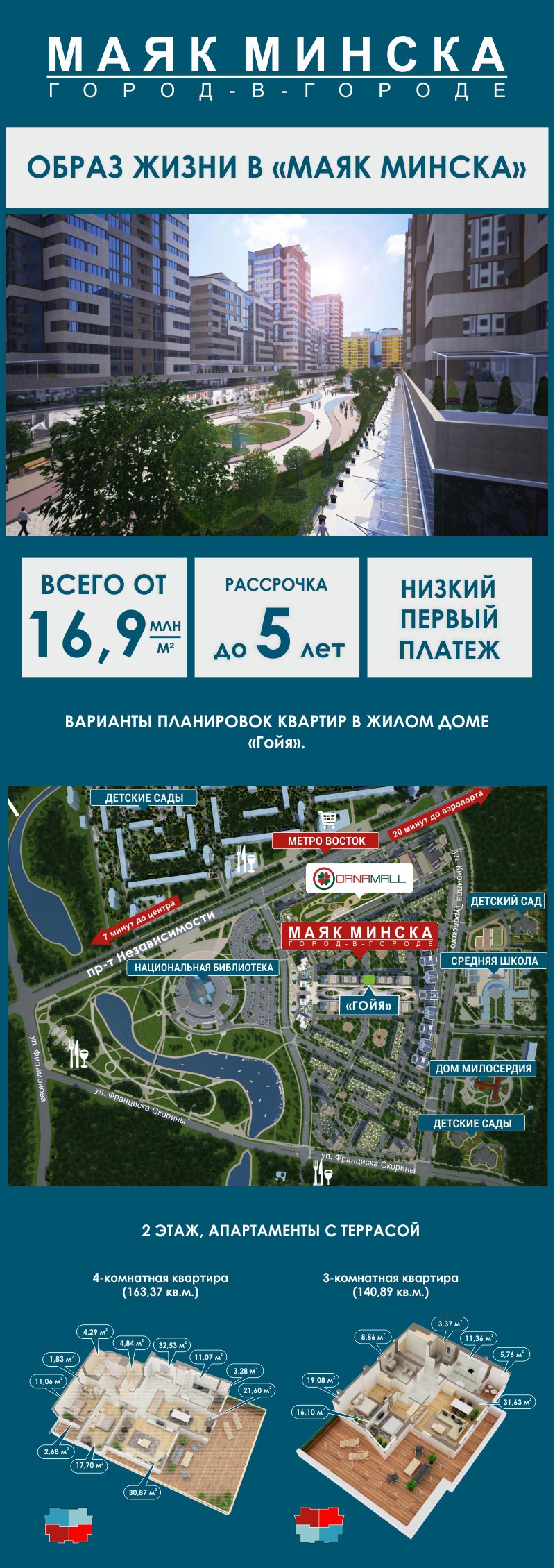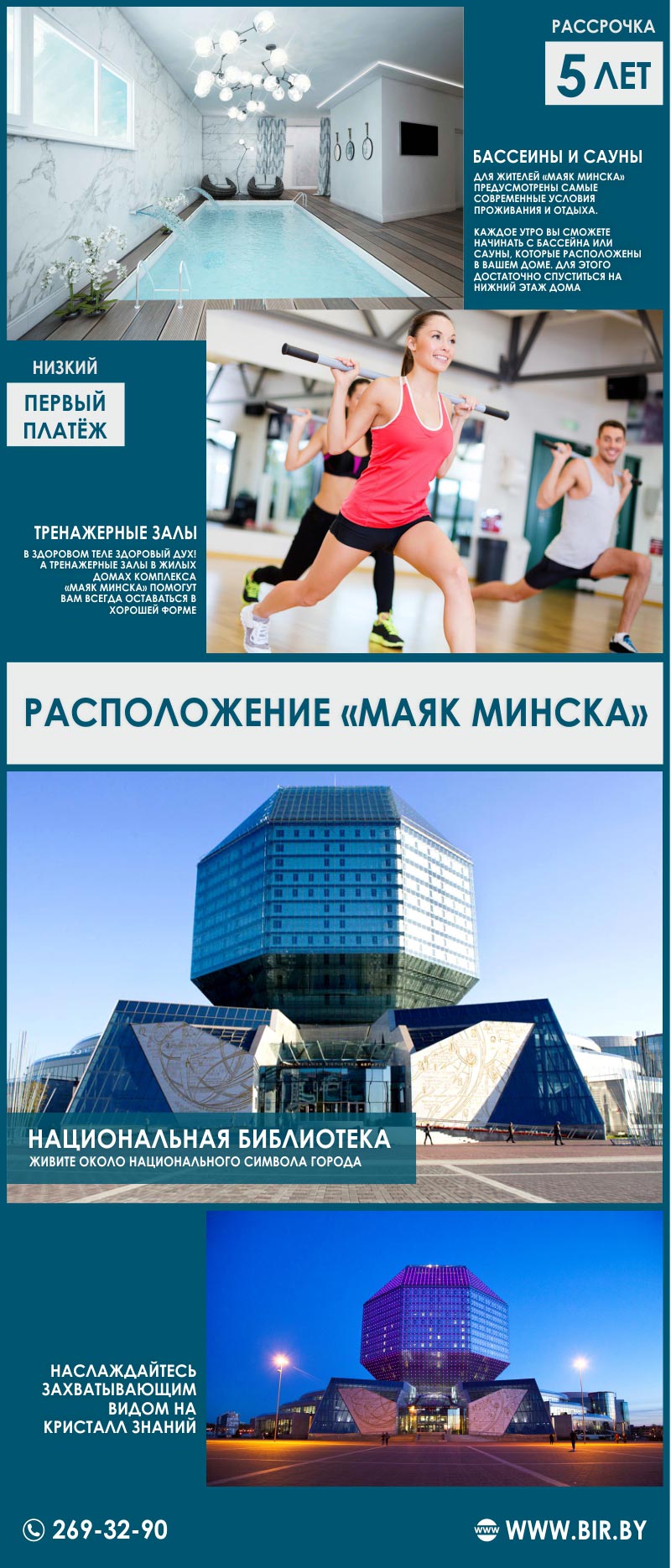 Многофункциональный жилой комплекс «Маяк Минска» — это настоящий «город в городе», уникальная урбанистическая система для комфортного и полноценного проживания семей, в которой найдется место и для активного отдыха, и для работы, и для развлечений. Прекрасным преимуществом комплекса является его расположение: напротив Национальной библиотеки и около ст.м. «Восток».
