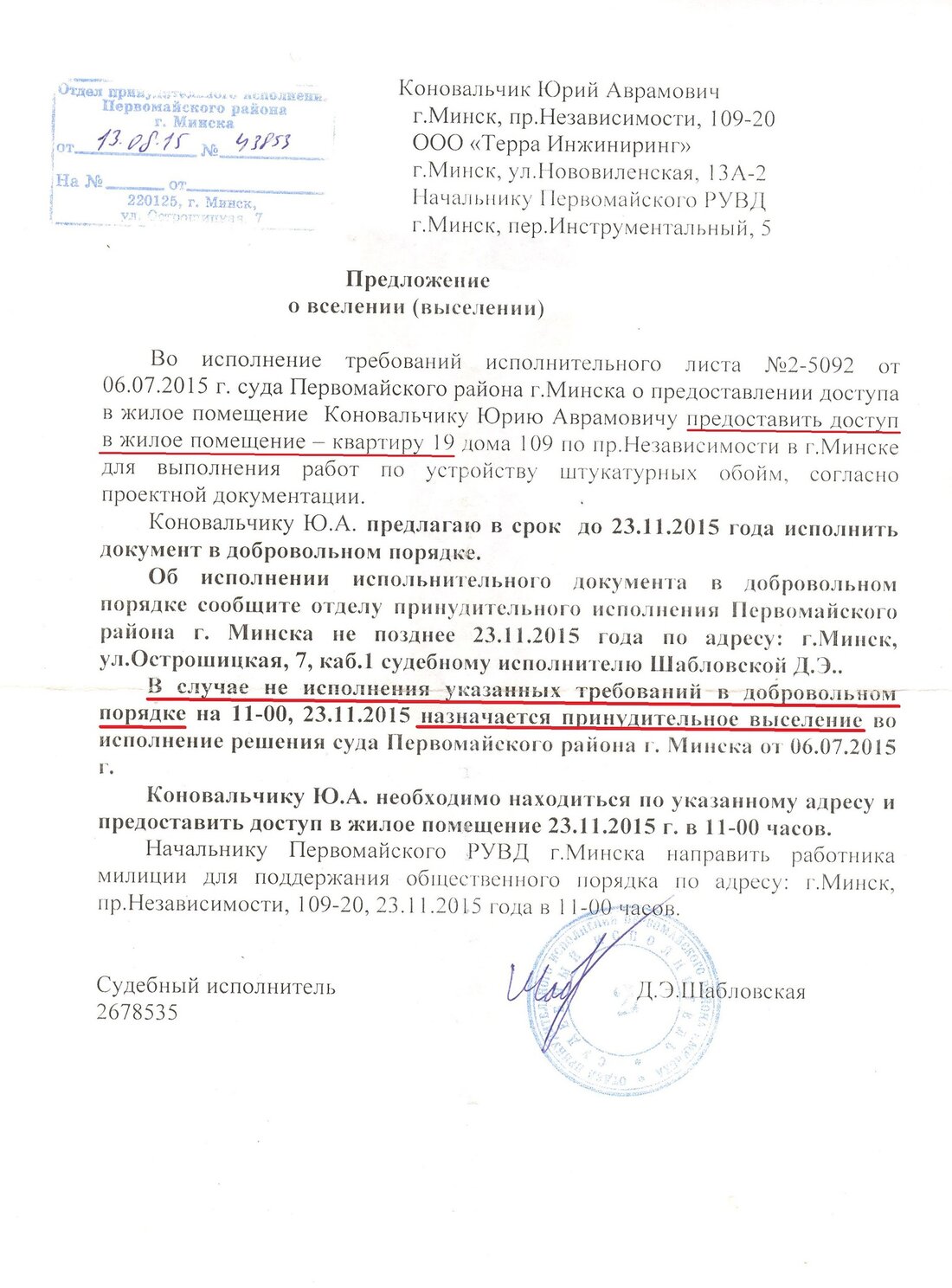 — Судом вынесено решение о предоставлении доступа в двадцатую квартиру, — объяснила судебный исполнитель, прибыв по адресу. — В случае, если жилец этот доступ не предоставит, я обязана вместе с понятыми заполнить заявление о том, что доступ предоставлен не был. На этом всё, никакого выселения в этом случае не предусмотрено. Всё остальное — номер квартиры и сведения о возможном выселении — моя оплошность, я прошу за нее прощения.