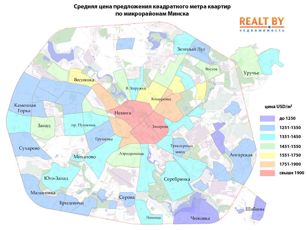 Распределение предложения квартир по районам Минска выглядит следующим образом: