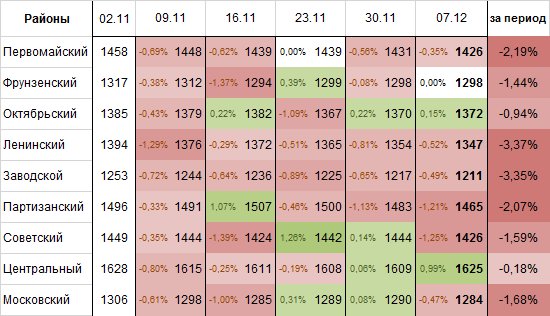 Динамика изменения цен предложения квартир в районах Минска на 7 декабря выглядит следующим образом: