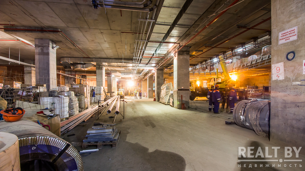 Комплекс также включает в себя многоуровневый паркинг на 1000 машиномест. По словам представителей ТРЦ, паркинг уже готов на 98%. Однако с запуском объекта в эксплуатацию придется повременить. Из-за строительства метро по просьбе города была открыта дорога и благоустроена территория прилегающая к ней, потому сейчас строителям, кроме как на паркинге, развернуться негде — здание паркинга используется для размещения персонала подрядчика и строительного городка. Как только надобность пропадет, объект будет использоваться по назначению. Занятно, что проект паркинга был разработан при участии доктора наук из Германии. Конструкция объекта исключает привычную для нас внутреннюю сетку колонн, что создает все условия для наиболее комфортабельной парковки.