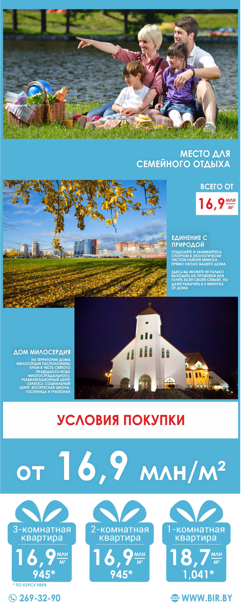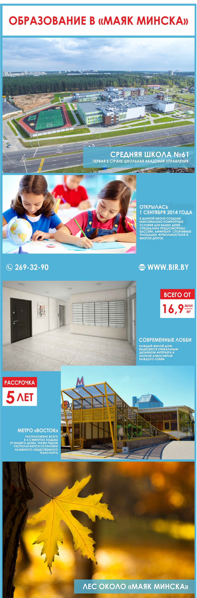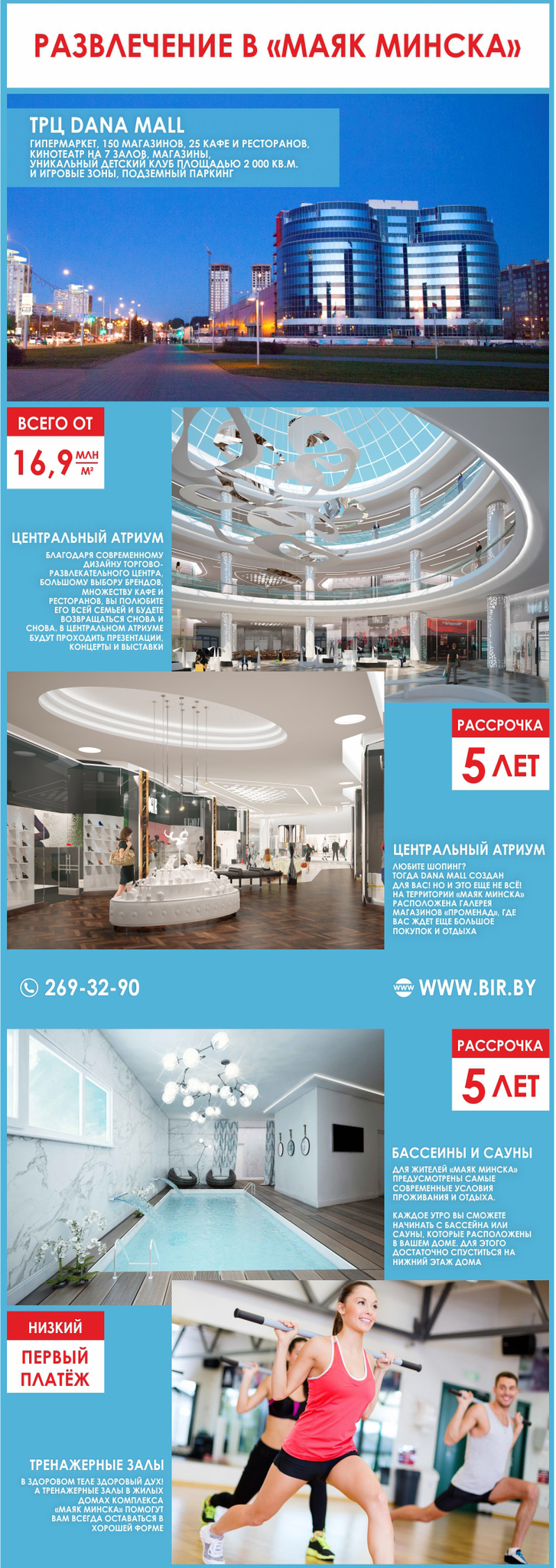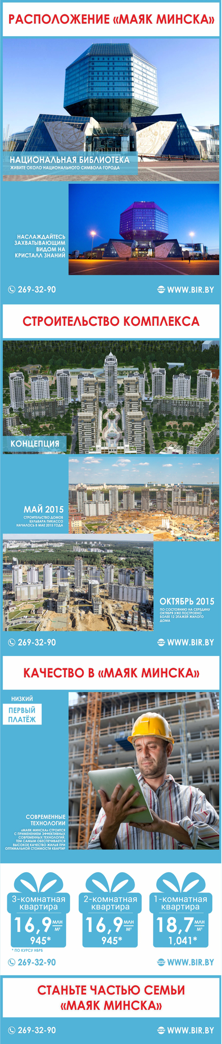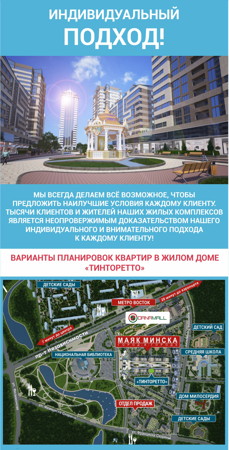 Многофункциональный жилой комплекс «Маяк Минска» — это настоящий «город в городе», уникальная урбанистическая система для комфортного и полноценного проживания семей, в которой найдется место и для активного отдыха, и для работы, и для развлечений. Прекрасным преимуществом комплекса является его расположение: напротив Национальной библиотеки и около ст.м. «Восток».