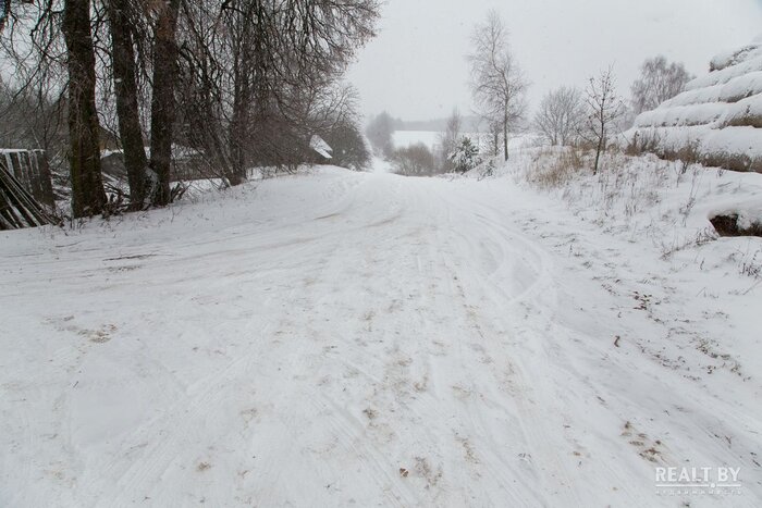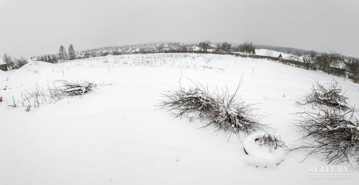 Участок общей площадью 14 соток выделен прямо в поле на приличном расстоянии от жилого квартала — до ближайшего дома порядка 100 метров. Подъезд к территории участка довольно условный, накатанная дорога вся в буграх и наплывах, после небольшого снегопада подъехать прямо к территории участка у нас не получилось. Вокруг участка пока что красуется чистое поле, ни справа ни слева соседей нет, свободные от застройки участки также распродаются через аукционы. Места здесь живописные, рельеф холмистый, вокруг поля и леса. А вот коммуникаций поблизости нет.