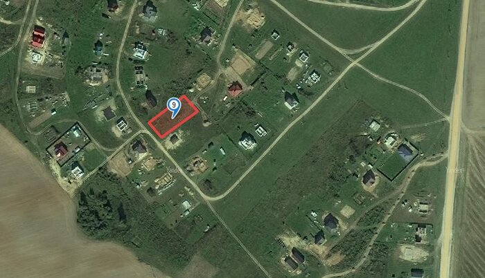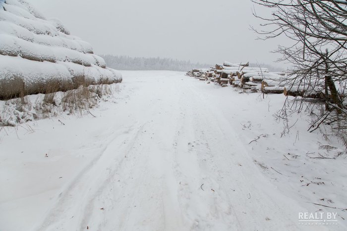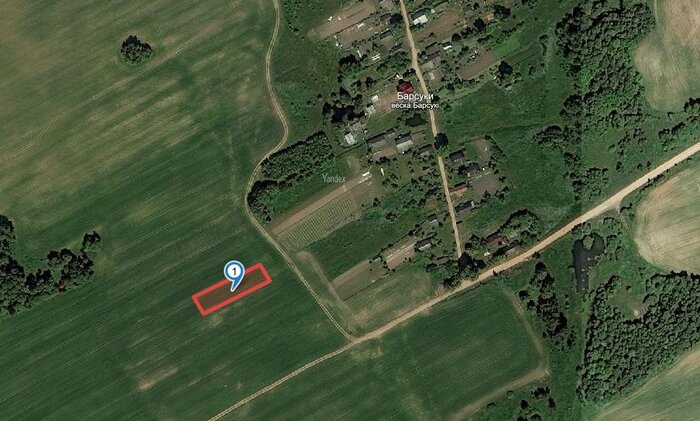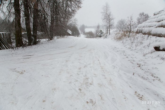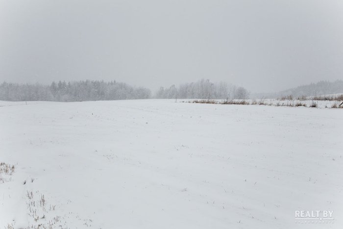 Участок выделен прямо в поле на приличном расстоянии от жилого квартала — до ближайшего дома порядка 100 метров. Подъезд к территории участка довольно условный, накатанная дорога вся в буграх и наплывах, после небольшого снегопада подъехать прямо к территории участка у нас не получилось. Вокруг участка пока что красуется чистое поле, ни справа ни слева соседей нет, свободные от застройки участки также распродаются через аукционы. Места здесь живописные, рельеф холмистый, вокруг поля и леса. А вот коммуникаций поблизости нет.