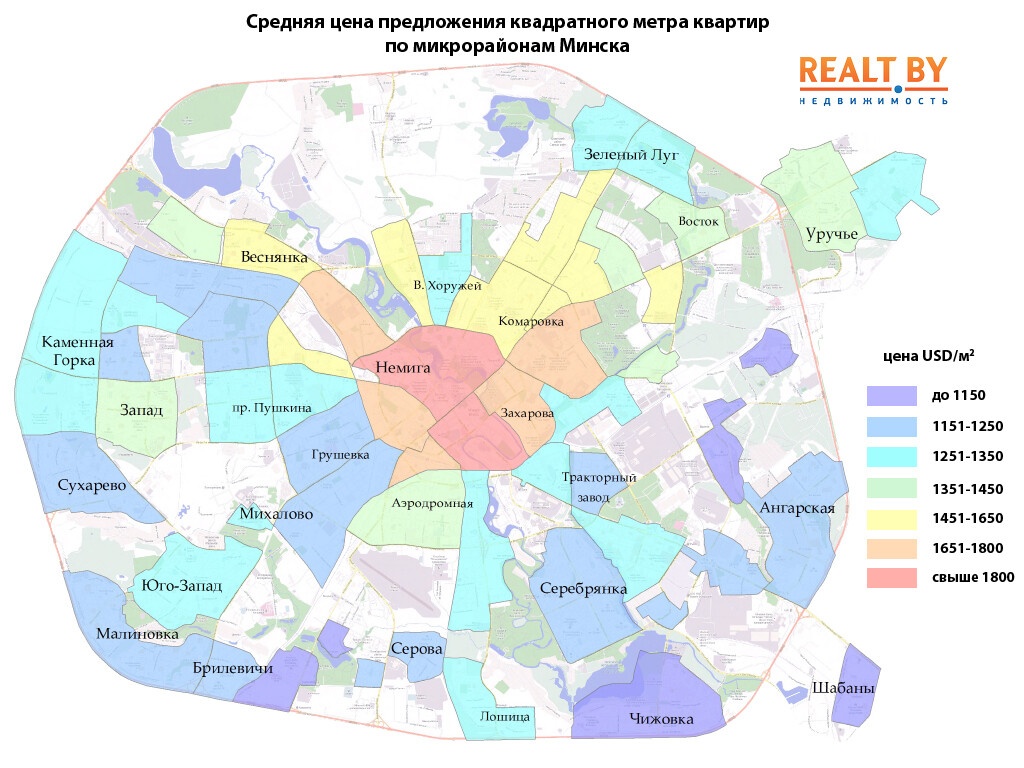 Распределение предложения квартир по районам Минска выглядит следующим образом:
