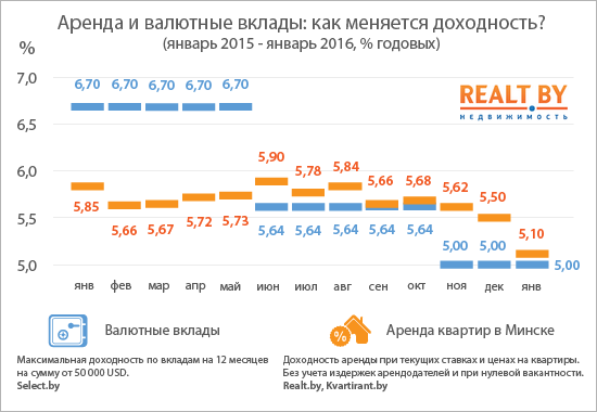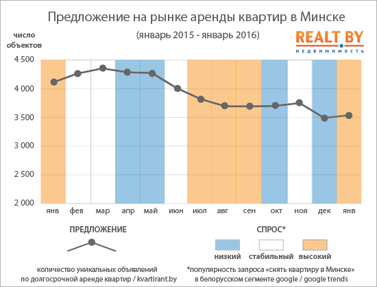 Январская коррекция — самая сильная за весь период с декабря 2014 года. До сих пор максимальные месячные темпы снижения достигали 6−8% (начало 2015 года). Арендодатели, которые указывают цены в белорусских рублях, по-прежнему составляют меньшинство, но их доля растет. Этот факт также влияет на столь стремительное снижение долларовых ставок.
