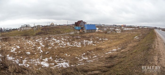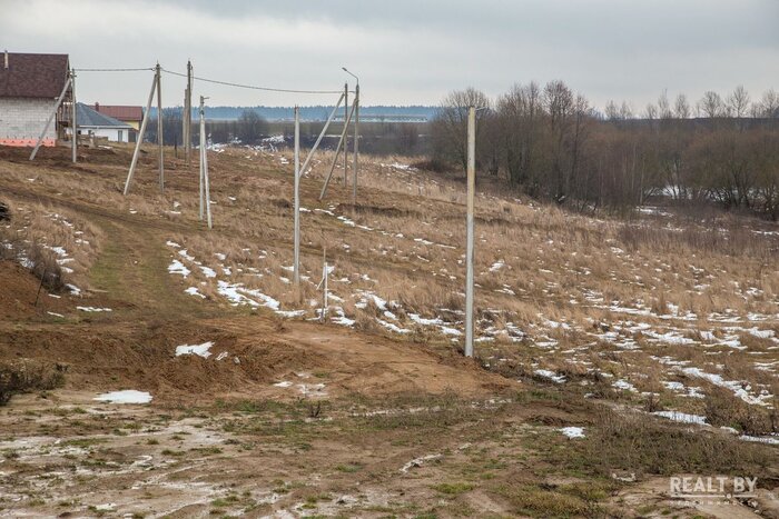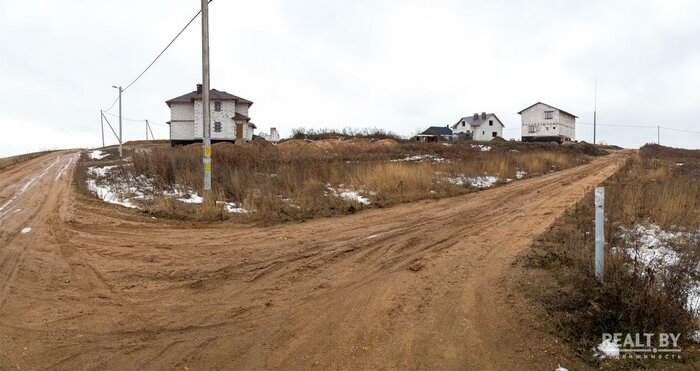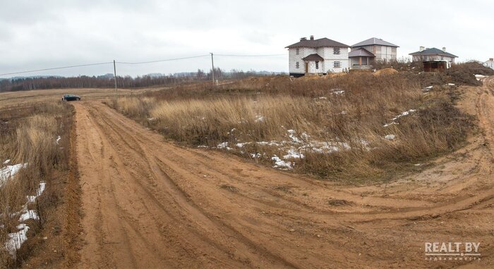 Участок выделен в квартале новой коттеджной застройки. Близлежащие соседи активно строятся. Подъезд — сносная гравийка. Напротив участка — поле. Сам участок ровный, удобный для строительства, чуть заросший высокой травой. Рядом виднеется водонапорная башня, кроме воды из коммуникаций имеется также и электричество.