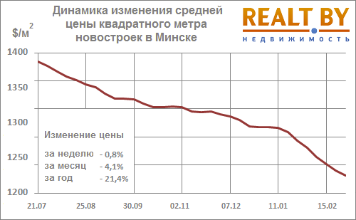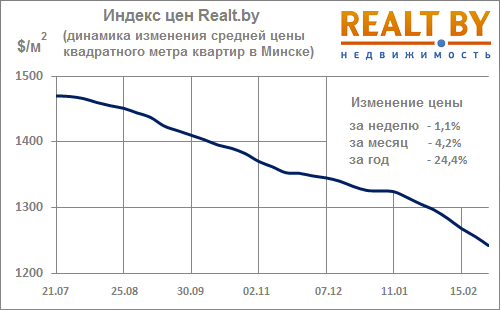 Последняя неделя февраля, как и её предшественники, прошла под знаком резкого снижения цен на квартиры в Минске. За последние 7 дней индекс цен вторичного рынка жилья снизился на 1,1% и составляет на данный момент 1242 $/м2. Скорость снижения цен в феврале была максимальной за последние 15 месяцев. Квадратный метр на «вторичке» подешевел более чем на 50 $.