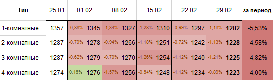 Цены на различные типы квартир за неделю претерпели следующие изменения: