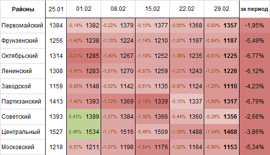 Динамика изменения цен предложения квартир в районах Минска на 29 февраля выглядит следующим образом:
