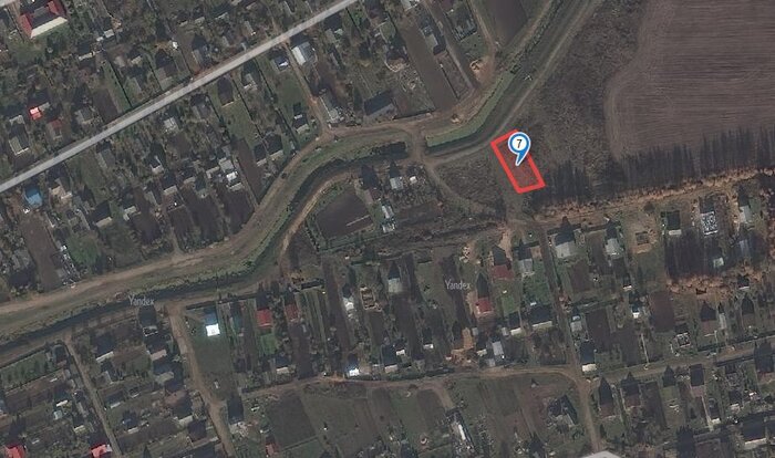 Участок выделен на пустыре, в низине, в непосредственной близости от жилых домов. За территорией земельного надела простирается поле, рядом — небольшой канал. Сам участок ровный, но низкий — скорее всего в дождь на площадке будет стоять вода. Подъезд — накатанная дорога. Из коммуникаций в деревне есть газ, электричество и водопровод. Близлежащие участки также распродаются через аукцион.