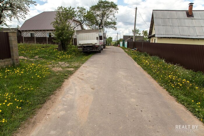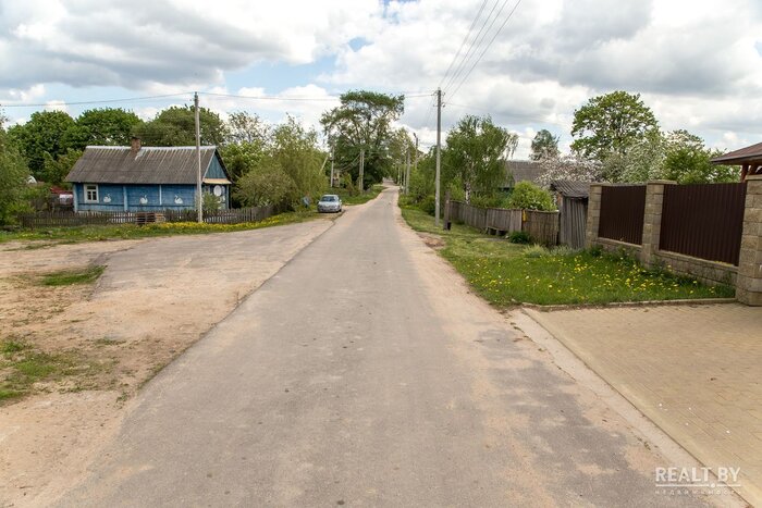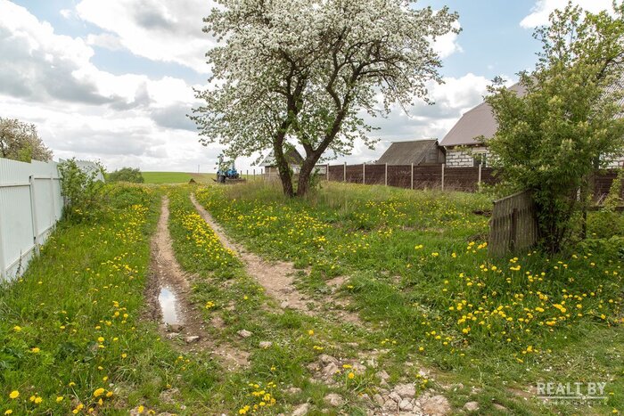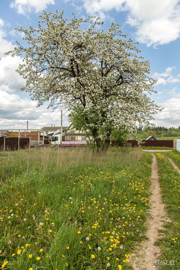 Участок выделен вдоль асфальтированной дороги в квартале жилой застройки. Вокруг простые дома, за земельным наделом — поле. На территории участка живописно цветет плодовое дерево. Площадка ровная, удобная для строительства. Из коммуникаций имеется только электричество.